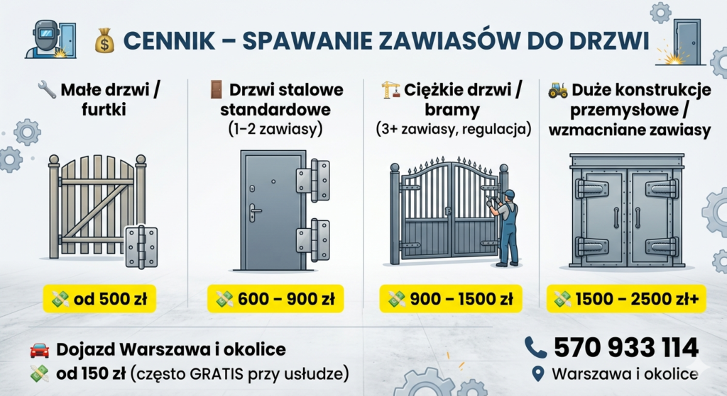 | Standard | 400–800 zł | Drobne naprawy, balustrady, bramy. | Legionowo, Jabłonna |